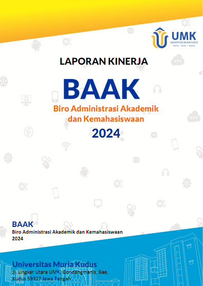 Laporan Kinerja Divisi Akademik Biro Akademik dan Aktivasi Universitas Muria Kudus ini menyajikan hasil capaian kinerja Divisi Akademik berdasarkan realisasi dan capaian target yang ditetapkan. Dari Laporan Kinerja ini diharapkan dapat memberikan informasi atas kinerja Divisi Akademik yang terukur kepada Kepala Biro Akademik dan Aktivasi atas kinerja yang telah dan seharusnya dicapai serta sebagai upaya untuk perbaikan dalam peningkatan kinerja di Divisi Akademik pada masa yang akan datang.